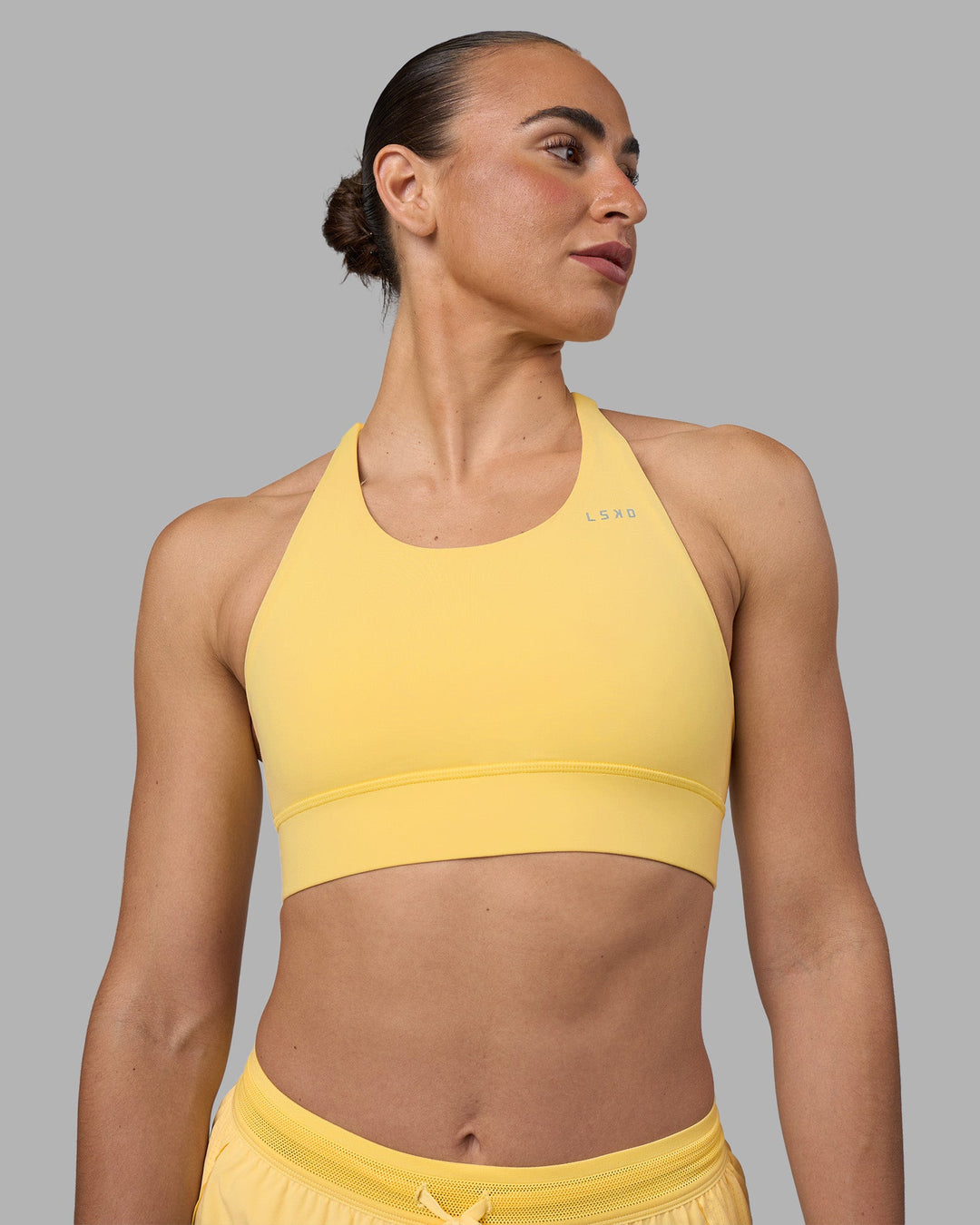 Woman wearing Accelerate Sports Bra - Lemon | Model:Sophie | Size:S