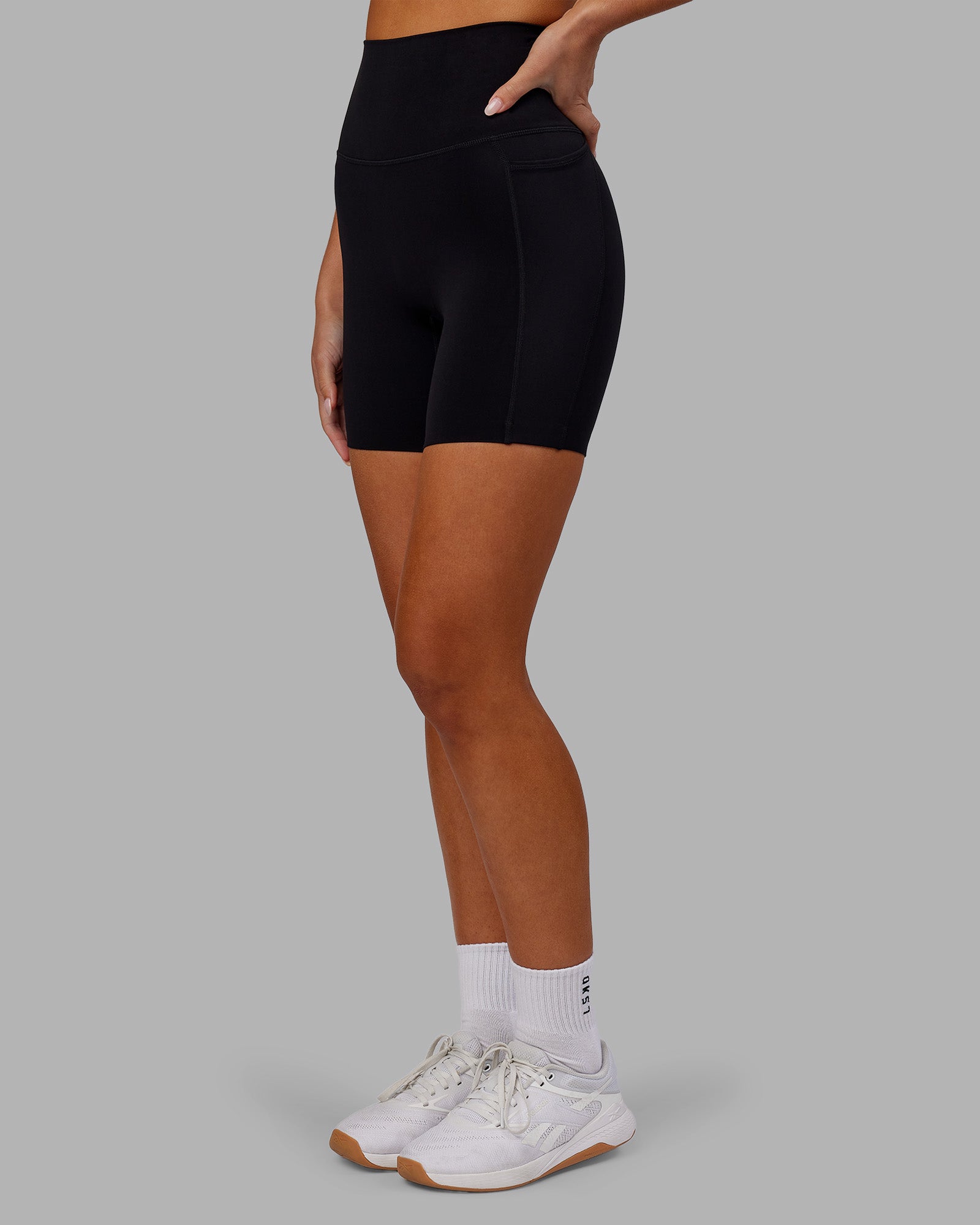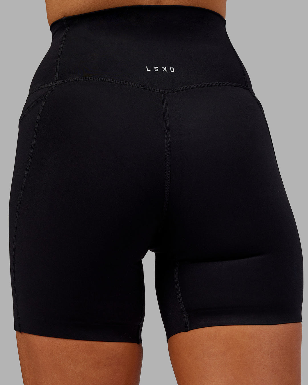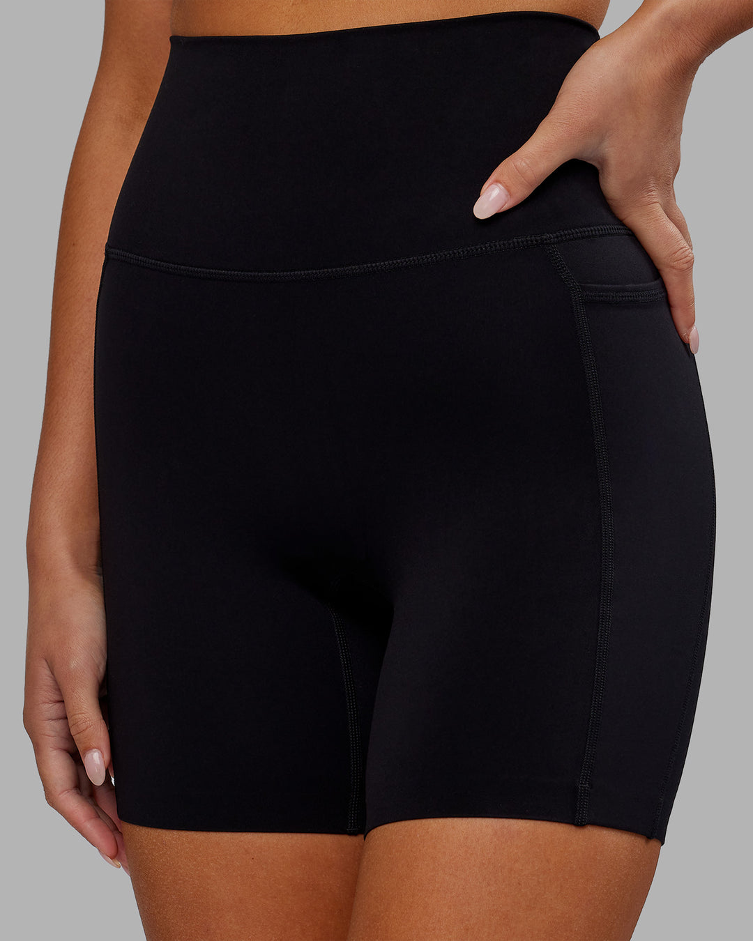 These Black Elixir Ultra High-Rise 6" Shorts with Pockets are the same Elixir Mid-Short Tights you know and love made with our ultra light and ultra soft Zephyr fabric, bringing real technical performance with a second-skin' feel. Featuring booty shaping contour panels, no front rise seam and now: dual phone pockets. Elixir hugs all the right corners and curves without rolling down, riding up or putting you at a functional loss.