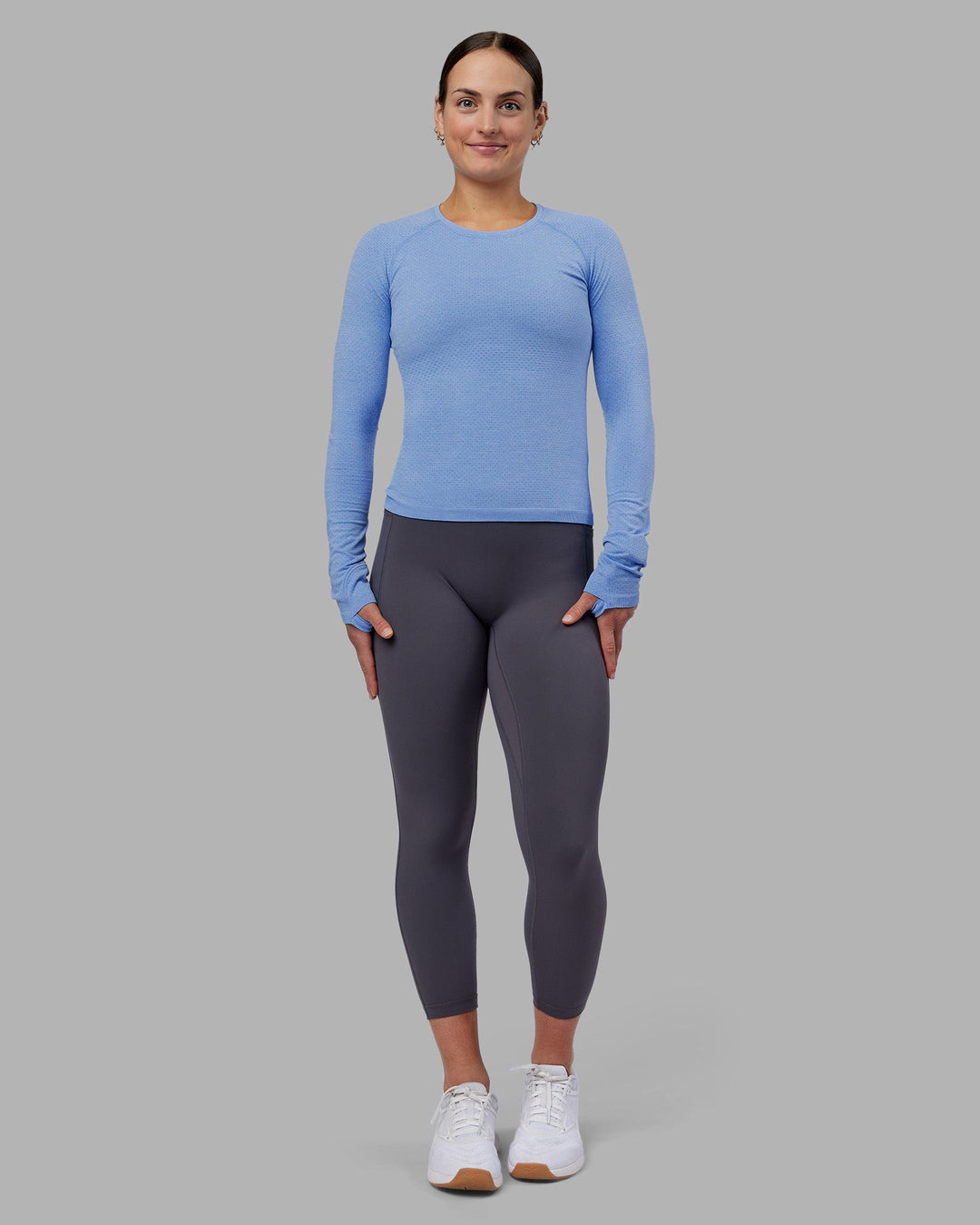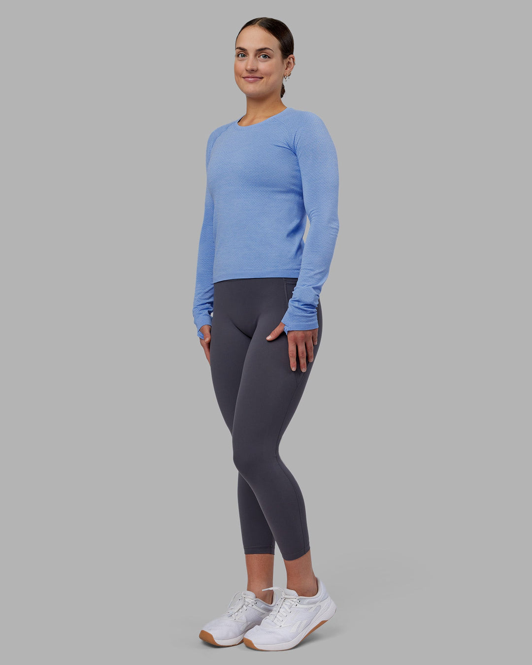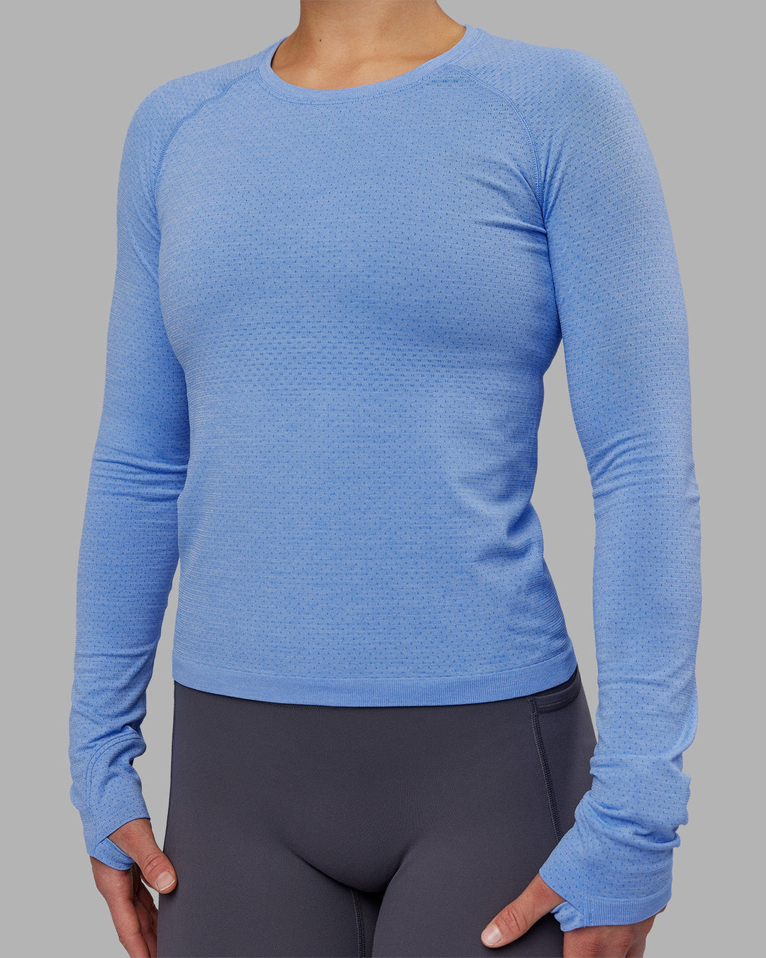 The Womens Cornflower Blue Marl AeroFLX+ Seamless Long Sleeve Tee features body-mapped ventilation that provides air flow and breathability where you need it most. Backed by over 18 months of research and development we analysed athletes body temperatures through a range of workouts and built the fit, feel and function of the fabric based on their needs.